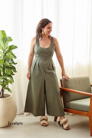 Macacão em tricoline, decote redondo frente e amarração nas costas. Cintura com elástico nas costas e fechamento de ziper invisivel lateral. Pernas pantalona amplas, com comprimento acima do tornozelo.