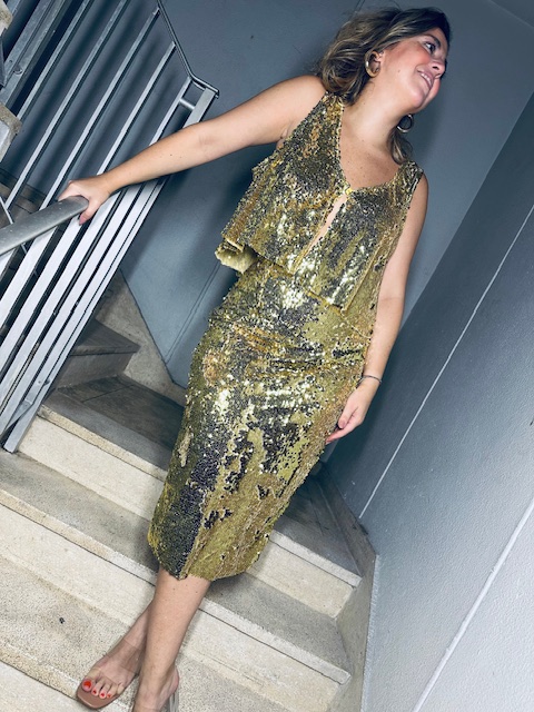 Saia midi em paetê, comprimento no meio da canela, com fenda na central nas costas e ziper invisivel.